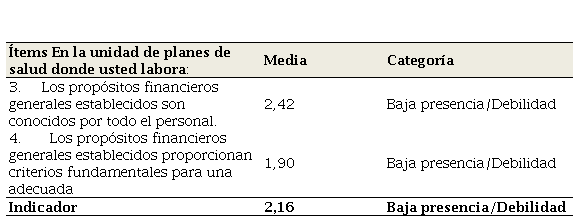 Continuando con el análisis del indicador: misión financiera se evidencia según la tabla 3, un promedio de 2,16 ubicándolo en la categoría de baja presencia, señalando debilidad al afirmar los encuestados que los propósitos financieros generales establecidos son conocidos por todo el personal (2,42) y que los propósitos financieros generales establecidos proporcionan criterios fundamentales para una adecuada inversión (1,90).