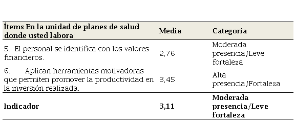 Con relación al indicador valores financieros, se evidencia según la tabla 4, un promedio de 3,10 ubicándolo en la categoría de moderada presencia, señalando leve fortaleza al afirmar los encuestados una moderada presencia respecto a que el personal se identifica con los valores financieros (2,76) y alta presencia de que aplican herramientas motivadoras que permiten promover la productividad en la inversión realizada (3,45).