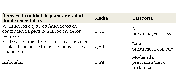 Así las cosas, los resultados derivados a criterio del investigador demuestran una leve fortaleza en las unidades de planes de salud de PDVSA Occidente, en cuanto, a la manera de dirigir las actividades para aplicar de manera planificada los recursos financieros, situación inconveniente, en función de alcanzar el rendimiento apropiado en sus actividades financieras.