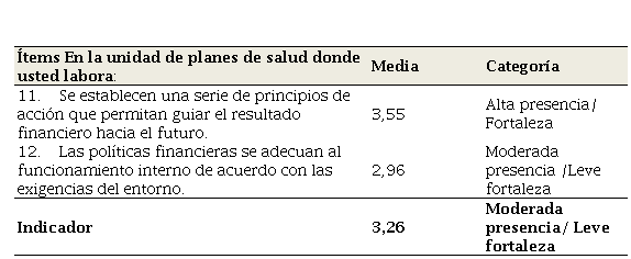 Con respecto al indicador políticas financieras, según los resultados mostrados en la tabla 7, se aprecia una media de 3,26 ubicándolo en la categoría de moderada presencia, señalando leve fortaleza, induciendo a afirmar a criterio de los sujetos informantes que con alta presencia se establecen una serie de principios de acción que permitan guiar el resultado financiero hacia el futuro (3,55) y con moderada presencia consideran que las políticas financieras se adecuan al funcionamiento interno de acuerdo con las exigencias del entorno (2,96).