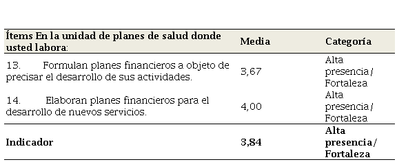 Respecto al indicador planes financieros se evidencia según la tabla 8 un promedio de 3,84 ubicándolo en la categoría de alta presencia, señalando fortaleza. Este resultado es producto al considerar los encuestados con alta presencia que se formulan planes financieros a objeto de precisar el desarrollo de sus actividades (3,67) y se elaboran planes financieros para el desarrollo de nuevos servicios (4,00).