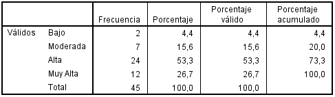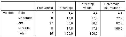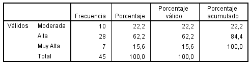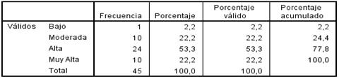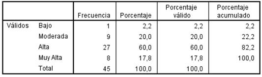 Según la tabla 5, puede notarse que un 53,3% de la población se ubicó en la categoría alta, seguida de la categoría muy alta con un 26,7%; un 15,6% ocupó la categoría moderada, en tanto que un 4,4% en la categoría baja.