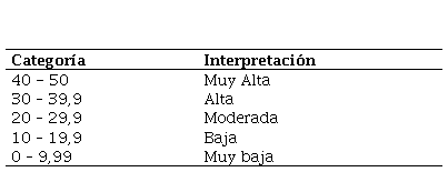 Los resultados son presentados según el baremo de interpretación como se muestra en la tabla 1