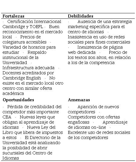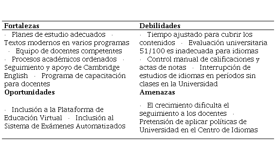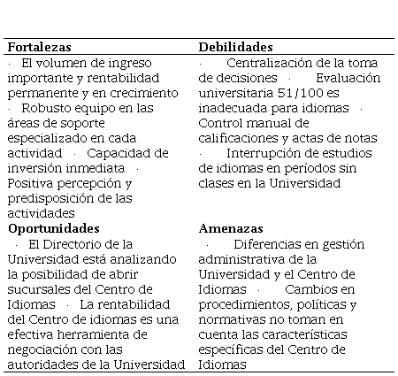 Luego de recibida la documentación solicitada a la institución y centralizados los datos obtenidos en las entrevistas y grupos focales, se procedió al análisis de Debilidades, Fortalezas, Amenazas y Oportunidades del Centro de Idiomas, en las áreas: Académica, Administrativa, de Recursos Humanos y Comercial. Al respecto, es importante mencionar que, tanto durante las entrevistas, como durante los grupos focales, los entrevistados y participantes fueron reiterativos en mencionar lo diferente que es la gestión de la Universidad y del Centro de Idiomas y como estas diferencias afectan al Centro de Idiomas en muchos aspectos.