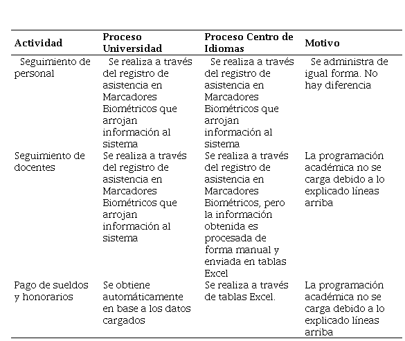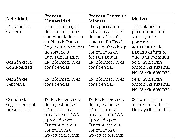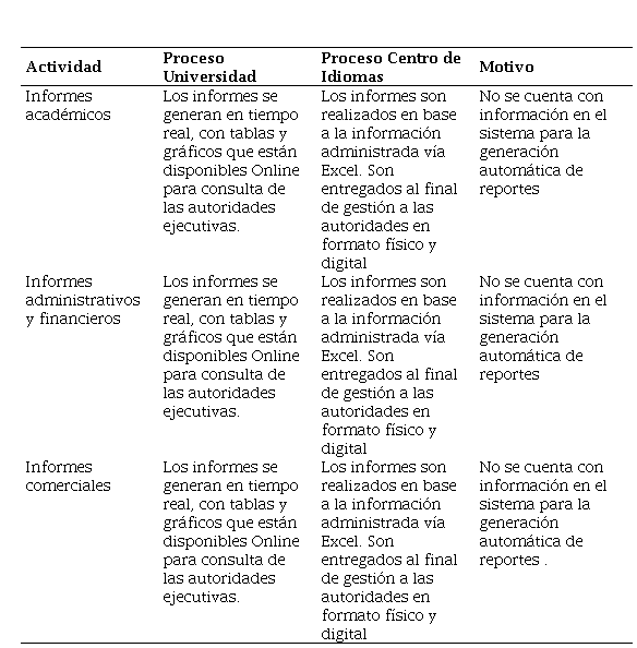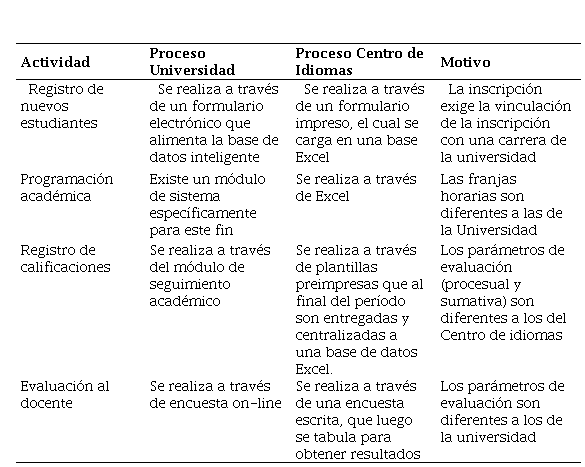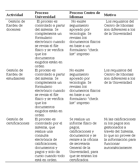 Con el objetivo de conocer el nivel de aprovechamiento de las herramientas a favor de la gestión del Centro de Idiomas se ha realizado un levantamiento de información, en base a la revisión de las actividades principales de la Universidad y del Centro de Idiomas y los procedimientos formalmente dispuestos para su administración, complementando los hallazgos con información resultante de las entrevistas conducidas a las autoridades. En los cuadros a continuación, se presentan los resultados obtenidos, comparando como se procesa la información de la Universidad y del Centro de idiomas, y los motivos de las diferencias en el procesamiento: