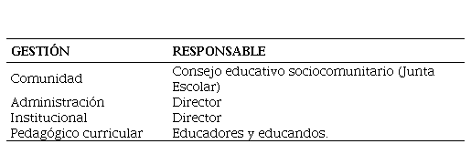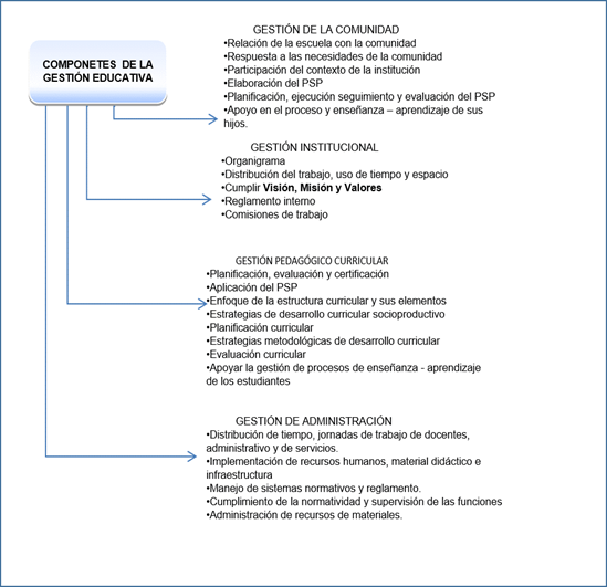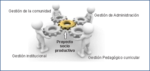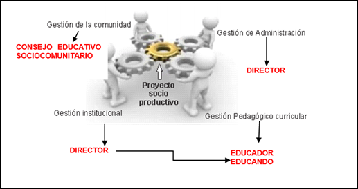 El cuadro y la figura anterior muestran que la gestión educativa esta descentralizada para un mejor funcionamiento, pero esta vez en relación al Proyecto socioproductivo, no permite distraerse en otras instancias. Los componentes de la Gestión Educativa junto a sus responsables giran en torno al Proyecto socio productivo. (PSP).
