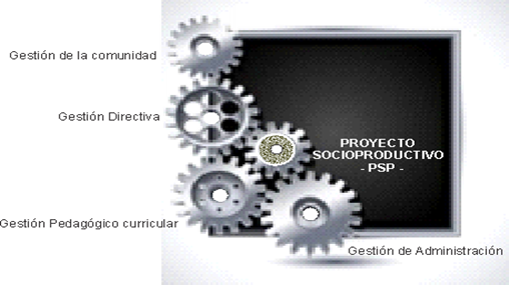 e) Coordinación entre componentes, la Gestión Educativa es todo un proceso, cuyo bagaje de actividades se desarrollan en los cuatro ámbitos o componentes antes expuestos, de tal manera que conforman un conjunto de engranajes interrelacionados con el fin de potenciar a la gestión escolar (Marconi, 2013, p. 11). Veamos la figura en donde se observa que el engranaje del PSP se integra con los engranajes de los niveles del proceso educativo, por ende todos giran en un mismo sentido para ejecutar el Proyecto socio productivo.