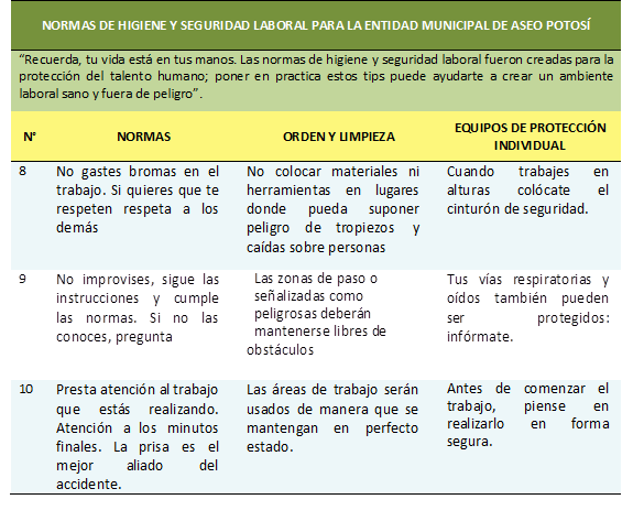 En este apartado se describen un conjunto de normas de higiene y seguridad laboral que fueron propuestas para la entidad como se muestran a continuación:
