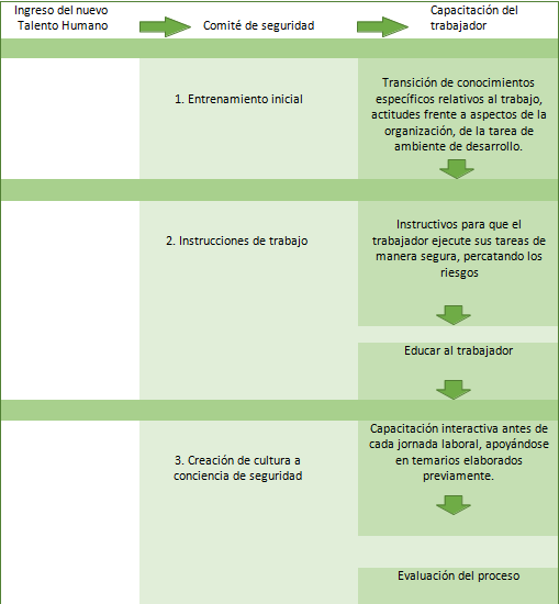 El anterior proceso muestra que el trabajador que requiere capacitación-educación (trabajador nuevo a ser promovido, o antiguo que necesite reforzamiento), debe ser supervisado por el comité de seguridad, para que el encargado del mismo proceda a su capacitación aplicando un entrenamiento inicial y los instructivos de trabajo. Seguidamente se describe el modo propuesta:
