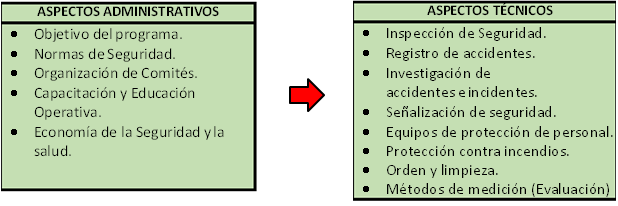 Aspectos administrativos. Hacen referencia a los objetivos de la empresa, afirmando que para llevarlos a efecto se requiere del planteamiento de cursos de acción acordes a las políticas de seguridad por escrito. Dentro de las políticas de seguridad está la implementación y el acatamiento de las normas de seguridad, las que tendrán prioridad sobre todas las normas de trabajo y producción.