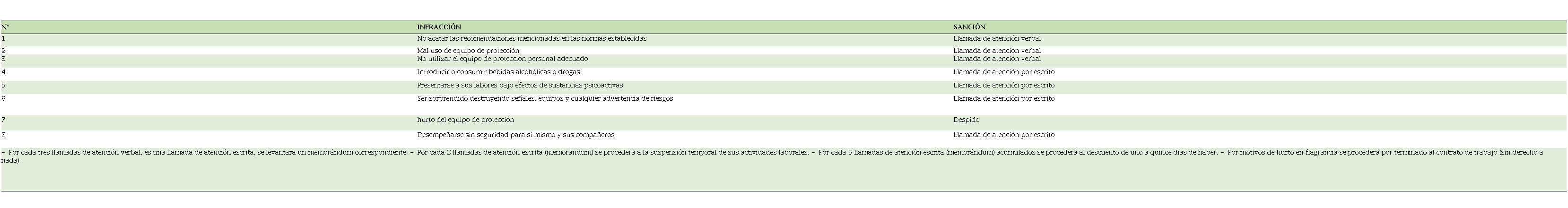 Todos los trabajadores deben cumplir con las normas de seguridad establecidas, para evitar en lo posible sufrir accidentes o enfermedades de trabajo, aquellos trabajadores que infrinjan o hagan caso omiso de las normas de seguridad, serán sancionados de la siguiente manera: infracciones y sanciones.