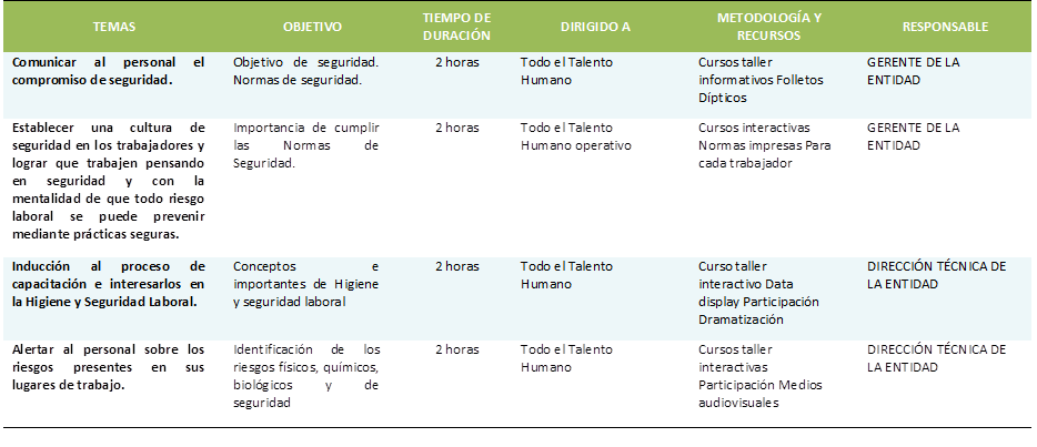 · Formar cultura de seguridad en el talento humano para mantener un lugar de trabajo libre de riesgos de accidentes y enfermedades profesionales a través del establecimiento de buenos hábitos de higiene y seguridad laboral.