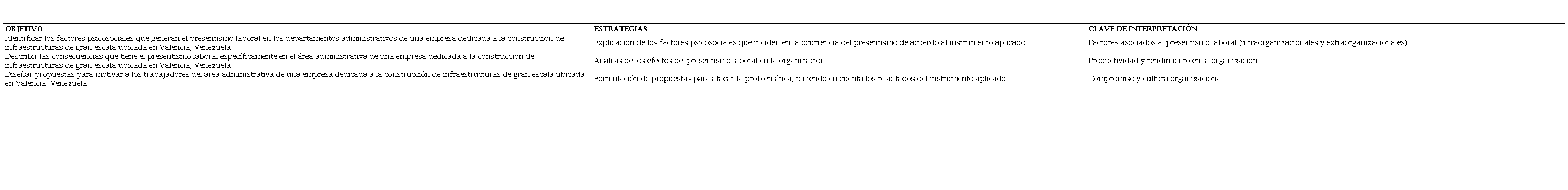Por ello, se planteó como objetivo general analizar los factores psicosociales que generan el presentismo laboral en el departamento administrativo de una empresa dedicada a la construcción de infraestructuras de gran escala ubicada en Valencia, estado Carabobo, Venezuela. También el estudio buscó identificar los factores psicosociales que generan el presentismo laboral en el departamento administrativo de una empresa dedicada a la construcción de infraestructuras de gran escala; a fin de describir las consecuencias que tiene el presentismo laboral específicamente en el área administrativa de una empresa dedicada a la construcción, para de esta manera diseñar propuestas para motivar a los trabajadores del área administrativa de una empresa dedicada a la construcción de infraestructuras de gran escala.