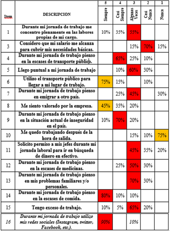 Por otra parte, se puede interpretar por medio de los resultados obtenidos que los factores extraorganizacionales asociados al presentismo laboral son la escases de transporte público, el uso del transporte público, deseos de emigrar, la inseguridad, la escases de medicinas, los problemas familiares y la escases de alimentos; reflejadas en los ítems 4, 6, 7, 9, 12, 13 y 14 respectivamente.