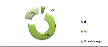 En el Gráfico 1 manifiesta que el 73% de los encuestados confirman que, el proceso formal de Gestión de Riesgos no es aplicado dentro del GAD Municipal. Así mismo, se puede observar que el 22% de encuestados considera que no está seguro, si existe un procedimiento formal y aún más si dentro de su área, se realiza identificación de riesgos. Estos resultados evidencian que el Consejo Municipal, representado como Gobierno Corporativo dentro del GAD Municipal, da prioridad a otros proyectos que si bien es cierto, son necesarios para cumplir con el Plan de Ordenamiento Territorial y el Plan Nacional del Buen Vivir para asegurar el desarrollo social y económico del cantón. Sin embargo, se evidencia su poca participación en el aspecto relacionado con la Gestión de Riesgos, ya que al no aplicarse, repercute de manera negativa en el cumplimiento de lo anterior expuesto. Por lo tanto, el funcionario público no recibe la inducción adecuada sobre Gestión de Riesgos y planes de contingencia. En este sentido, se está dando incumplimiento a la norma de control interno 300 Evaluación del Riesgo del subcomponente 300-02 Plan de mitigación de riesgos, que expresa que los directivos son los responsables en realizar un plan de mitigación documentado de tal forma que permita establecer estrategias para dar respuestas y monitorear los riesgos tanto internos y externos, emitiendo reporte con el fin de dar una comunicación efectiva, a todos los subordinados de cada área funcional.