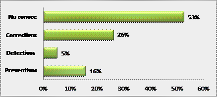 Según criterio de los funcionarios encuestados, el 53% indicaron que no conocen si se aplican controles dentro de sus áreas de trabajo. En cambio, el 26% de funcionarios indican que los controles internos establecidos, están encaminados a corregir errores y no a prevenirlos lo que influye de manera negativa en la identificación de riesgos en cada área funcional.