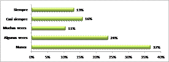 El Gráfico 3 expresa que el 37% de los funcionarios encuestados, afirmaron que nunca se realizaba seguimiento constante de sus actividades, para identificación de riesgos. Ya que, aseguraron que esta función le compete a la Contraloría y por ende solo existe control correctivo. Por otro lado, el 24% considera que algunas veces se realiza control y seguimiento en sus funciones; así mismo el 13% indican, que si se ejecuta el componente de control interno supervisión y monitoreo establecidos dentro de la norma de control interno 600 Seguimiento, del subcomponente 600-01 Seguimiento continuo o en operación.