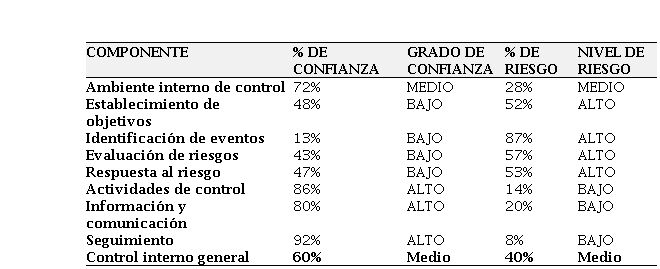 Se determina que de los ocho componentes del Control Interno basado en la Gestión de Riesgos, el Establecimiento de Objetivos, la Identificación de Eventos, la Evaluación al Riesgo y la Respuesta al Riesgo reflejan una confianza baja, siendo una situación preocupante para el área de talento humano, ya que se evidencia la falta de acciones para identificar eventos adversos. En promedio existe un 62% de riesgo, por tanto, es necesario también implementar controles urgentes, para dar una respuesta efectiva a los riesgos y prevenir que los planes y programas del área se vean afectados.