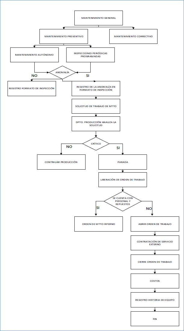 Como se puede observar en el gráfico 1, tanto el mantenimiento autónomo como las inspecciones periódicas deben informar anomalías, en caso de no existencia de anomalías se deberá registrar el informe detallando el estado. Por el contrario, en caso de detectar anomalías, los pasos a seguir son 1) registrar 2) solicitar trabajo y 3) la respectiva evaluación de la solicitud por parte del departamento de producción. En caso de ser procedente, se para la producción y se libera la orden de trabajo. Posteriormente, y solo en caso de no contar con personal interno, se abre la orden de trabajo.
