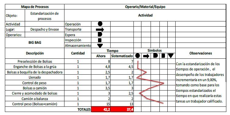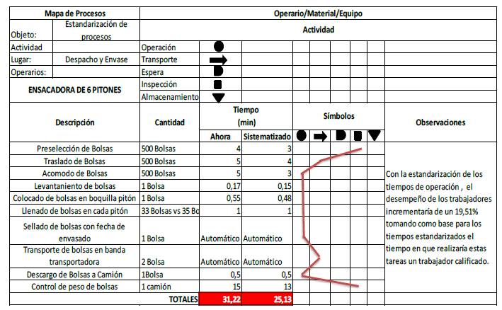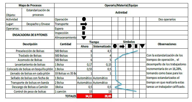 Con el estudio de tiempos se obtiene las horas ideales de trabajo, al compararlas con las horas reales presentan una diferencia del 19,51%, lo que significaría que es posible una reducción de tiempos de operación en dicho porcentaje. En este sentido, se propuso adecuaciones a los procesos de las ensacadoras de 6 y 8 pitones, en el gráfico 2 se muestra el mapa de procesos para la ensacadora 6.