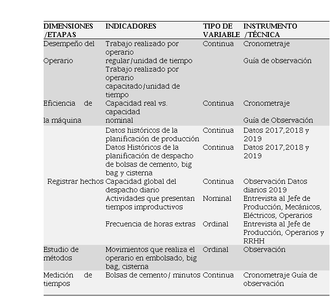 Se trata de un estudio con enfoque mixto y alcance relacional, tuvo como objetivo relacionar el estudio de tiempos con la productividad, ambas variables en sus respectivas dimensiones fueron tratadas como numéricas y nominales. El estudio del trabajo se desglosó en tres etapas: registro de hechos, estudio de métodos y medición de tiempos. Consecuentemente, se abordó el estudio de la productividad midiendo el desempeño de cada operario y la eficiencia de cada máquina. Con estos fines, se usó la técnica de la observación indirecta, participantes, estructurada y de campo, para controlar y cronometrar los tiempos de operación tanto de la maquinaria como los operadores y su desempeño. También ayudó con el registro de los movimientos que realizan los operarios en sus diferentes actividades. De la misma manera, se aplicaron entrevistas temáticas personales al jefe de recursos humanos y operadores del área. También se hizo una revisión bibliográfico de datos estadísticos del periodo 2017-2019. El siguiente cuadro muestra la herramienta específica usada para cada propósito.