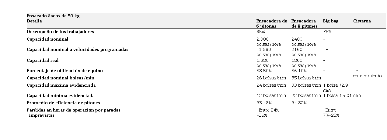 Como se puede observar en la tabla 2, la modalidad cisterna funciona a requerimiento, por tanto, no fue factible evaluar las variables, además como representa una producción mínima no se consideró relevante proceder con un estudio a profundidad. En cuanto a la modalidad ensacada, se evidenció que el comportamiento es similar para 6 u 8 pitones, resalta la posibilidad de elevar la eficiencia en 6% para ambas maquinarias, asimismo es posible incrementar la utilización de las máquinas hasta en un 14%. Finalmente, en la modalidad big bag, no es posible medir las variables: capacidad nominal, capacidad nominal a velocidades programadas, capacidad real, porcentaje de utilización de equipo, capacidad nominal bolsas/min y promedio de eficiencia de pitones.