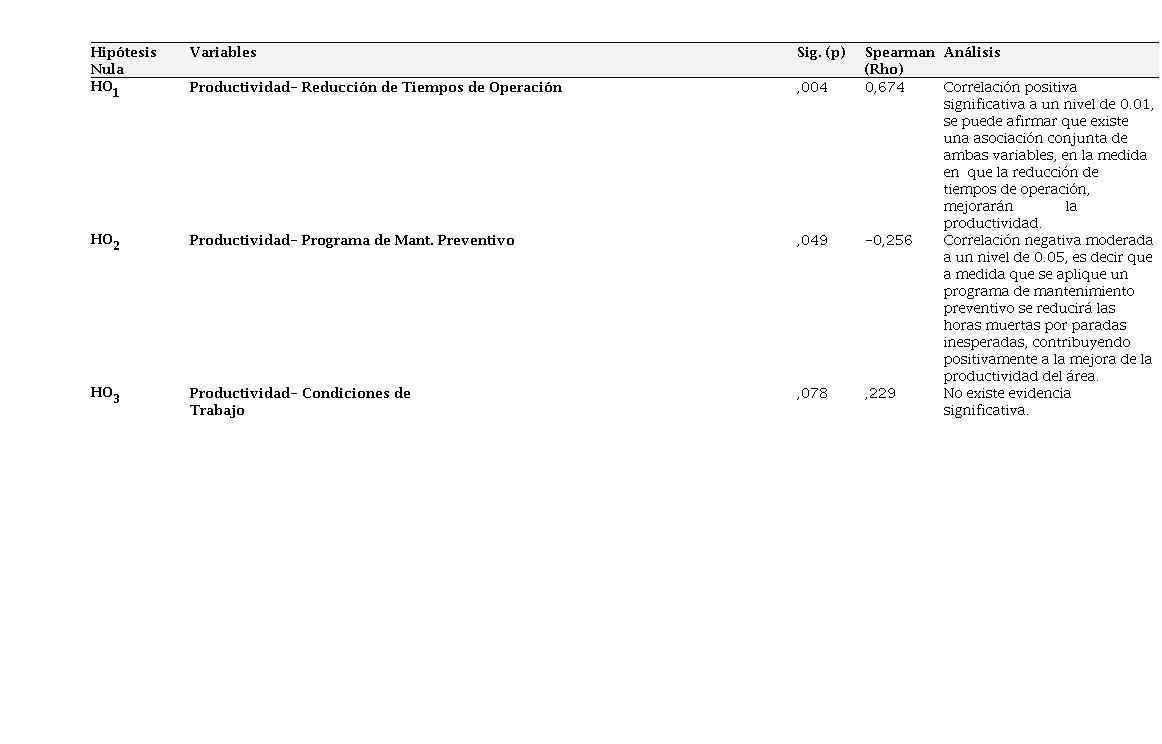 Para HO3, el nivel de significancia es menor a 5%, por tanto, se rechaza la hipótesis nula, es decir, se afirma que la implementación de un programa de mantenimiento preventivo si mejorará la productividad del área.