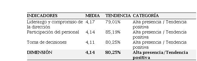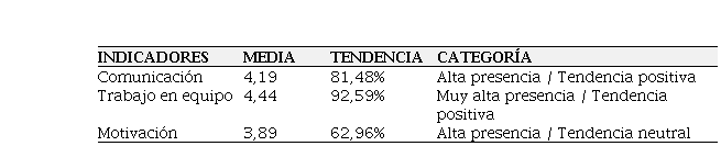 La situación es explicada por que el trabajo en equipo arriba a muy alta presencia (4,44), con tendencia positiva (92,59%); mientras que los procesos de comunicación y motivación fueron catalogados con alta presencia (4,19 y 3,89; respectivamente), con tendencia positiva en el primero (81,48%) y neutral para el segundo (62,96%). Lo que determinó alta presencia para el liderazgo y compromiso de la dirección, con tendencia positiva de las respuestas.
