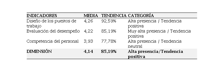 La situación precedente es explicada por que los procesos que componen a la dimensión muestran muy alta y alta presencia, alcanzando medias de 4,26; 4,22; 3,93; respectivamente. Se hace notar que la competencia del personal es el único proceso que arriba a la categoría de alta presencia.