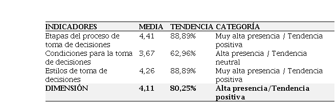 La situación precedente es explicada por que los procesos relacionados a la toma de decisiones, considerados en esta investigación, muestran muy alta y alta presencia, alcanzando medias de 4,41; 3,67; y 4,26; respectivamente. De forma tal que, tanto las etapas del proceso como las condiciones para la toma de decisiones ostentaron muy alta presencia; mientras los estilos se catalogaron con alta presencia. Al mismo tiempo se observan tendencias positivas de las respuestas obtenidas para los indicadores categorizados con muy alta presencia, y de tendencia neutral para el de alta presencia.