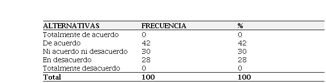 En la tabla 1, se muestra que, el 53% de los encuestados indicaron que se sienten orgullosos de pertenecer a la institución; por otra parte, el 28% no se encuentran ni en acuerdo ni en desacuerdo con la afirmación; un 13% de los trabajadores están totalmente de acuerdo en el sentimiento de orgullo que siente de formar parte de la organización y finalmente un 6% en desacuerdo.