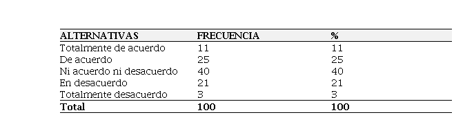 En la tabla 2 se muestra que, el 40% de los trabajadores de la empresa tienen un nivel medio de acuerdo en lo que corresponde a la oportunidad para aprender y crecer laboralmente; por otra parte, el 25% sienten que han podido incrementar sus conocimientos y ascender dentro de la institución, sin embargo, un 21% piensa totalmente lo contrario; un 11% está totalmente de acuerdo, mientras un 3% totalmente en desacuerdo.