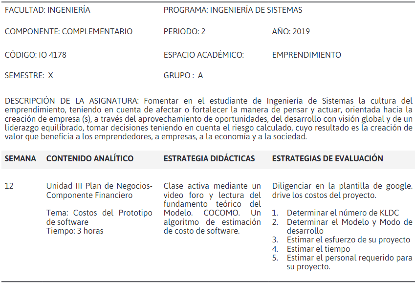 Ruta de aprendizaje del modelo COCOMO incorporado en el espacio académico de emprendimiento en el programa de Ingeniería de Sistemas: La práctica pedagógica y de enseñanza: