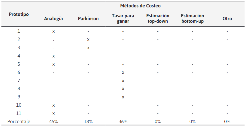 En un primer momento, se obtuvieron los Métodos de Costeo (Tabla 2) utilizados para estimar los costos de los prototipos socializados por los estudiantes en el cual se aprecian los métodos empleados para estimar los costos, como se relacionan a continuación: