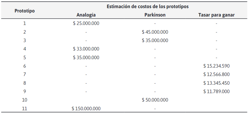 La Tabla 2 permite apreciar que el 45% de los grupos emplearon el método por Analogía, el 36% el método de Tasar para ganar y un 18% el método de Parkinson, los otros modelos no fueron utilizados y tampoco se mencionó algún otro modelo diferente. Los costos estimados se analizan en la siguiente Tabla 3.