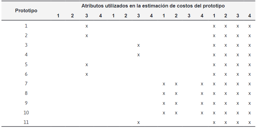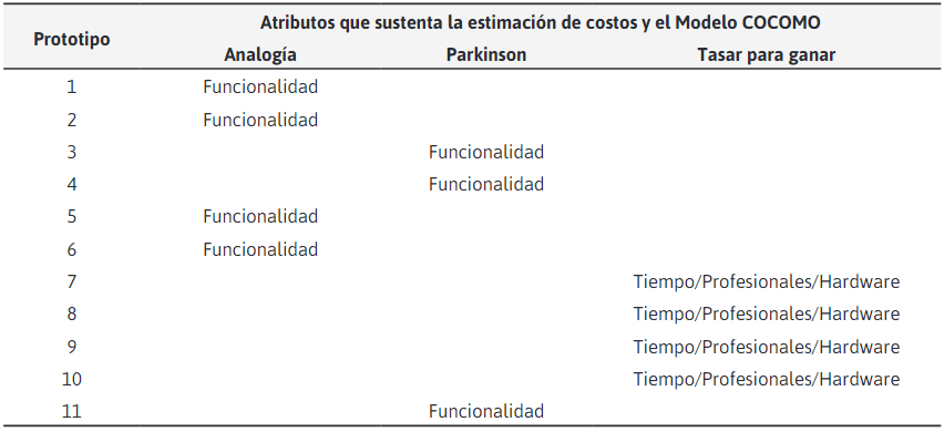 Los resultados anteriores permiten apreciar que la utilizan del modelo COCOMO consideran varios atributos para la estimación de costos del prototipo, como se aprecia en la siguiente Tabla 7: