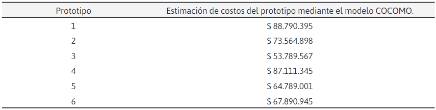 En un segundo momento, se socializa el método COCOMO y desarrollan paso a paso la aplicación de los coeficientes hasta llegar a los multiplicadores de esfuerzo (Tabla 5), las estimaciones de costos de los diferentes prototipos se relacionan a continuación: