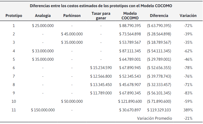Teniendo en cuenta los resultados obtenidos en un momento inicial y en segundo momento, se aprecia que los métodos de estimación de costos subestiman en un promedio del 21% la estimación real de los costos, que oscilan entre el 83% hasta en un 35% la estimación de costos es inferior con respecto al costo obtenido con el método COCOMO. Y en un prototipo su estimación es superior a lo obtenido en el método COCOMO en 389%, es decir, que el costo estimado por el modelo COCOMO es inferior al obtenido por el método de Analogía. En otros prototipos por el mismo método se obtuvo una estimación inferior.