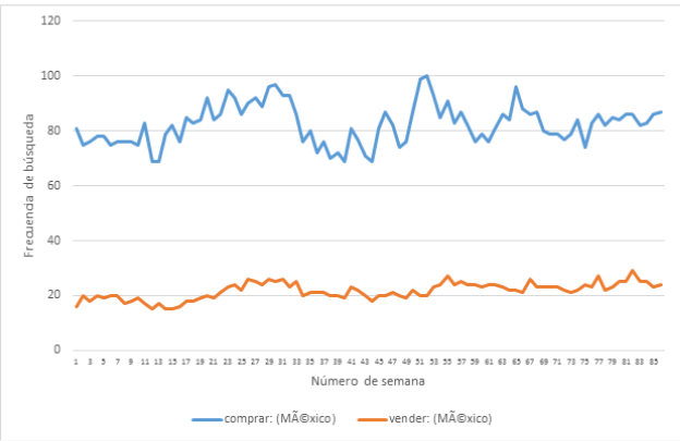 Como puede advertirse en la Figura 1, la tendencia comparada en las palabras de búsqueda COMPRAR y VENDER representa un interés significativo por la acción de comprar en contraste con la acción de vender. Adicionalmente la gráfica indica que el interés por comprar parecía ser constante desde la semana 1 hasta la 11 que correspondió desde el 1 de enero de 2020 hasta el 8 de marzo del mismo año; se observa un descenso en las siguientes dos semanas, sin embargo parece crecer el interés por comprar hasta la semana 30 que comienza a partir de 19 de julio de 2020. El punto máximo del interés de comprar se manifestó la semana 52 que coincide con el inicio de la época decembrina después de dos picos altos de las semanas iniciadas el 4 de octubre y 8 de noviembre de 2020 respectivamente.