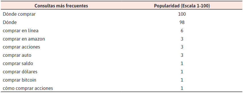 En la Tabla 1 se exhiben las consultas más frecuentes relacionadas con el interés de comprar, es importante recordar que Google Trends utiliza una escala del 1 al 100 para indicar la frecuencia de consulta entre la que destaca para este caso el concepto de LUGAR principalmente como dos de las consultas más frecuentes. Se destaca también la forma de compra, en particular EN LÍNEA, así como tiendas virtuales particulares; con menor frecuencia se hacen visibles los productos posibles de comprar sobre los que se muestra el interés como lo son: acciones, autos, saldo, dólares y criptomonedas