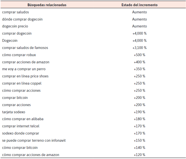 Por su parte, en la Tabla 2 se da muestra del comportamiento de las búsquedas relacionadas con el interés de comprar, se destaca un aumento significativo con la compra de saludos y criptomonedas tipo dogecoin, las cuáles fueron creadas desde el 2013 y han tenido mucha aceptación por el apoyo de figuras públicas en el mundo. Estas búsquedas relacionadas aumentaron de forma importante.