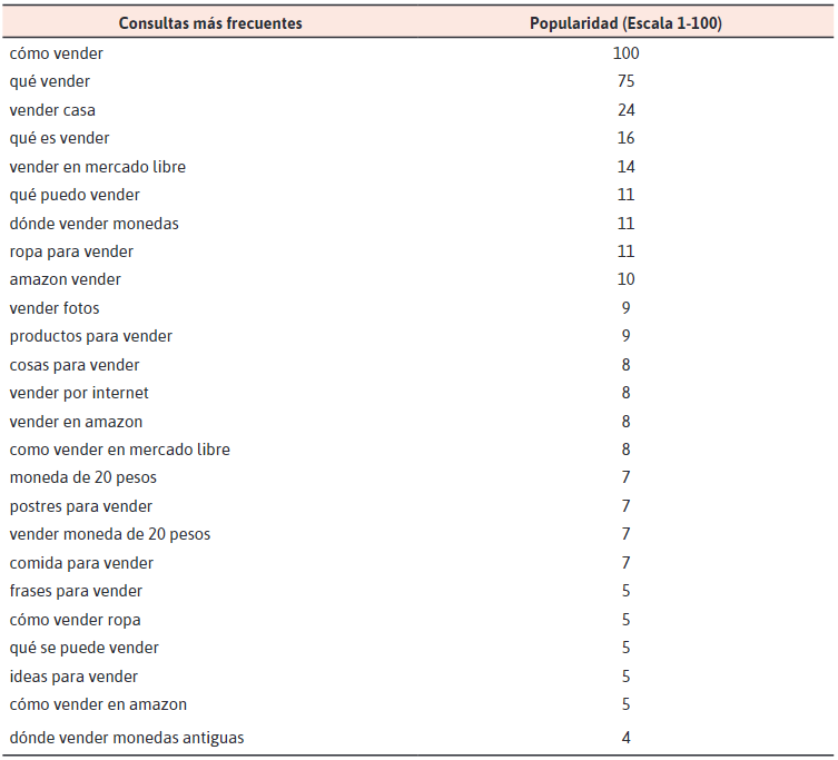 En la Tabla 3 se concentran las principales consultas con relación al interés por vender, en una escala de popularidad marcada por Google Trends, las búsquedas más populares corresponden a “cómo vender” y en seguida le continúa “qué vender”.