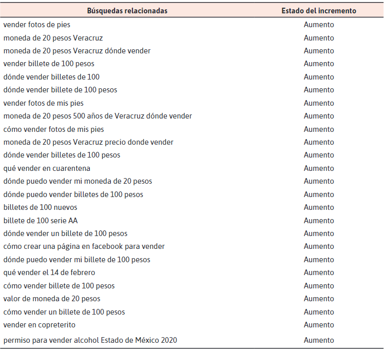 Con respecto a las búsquedas relacionadas con el interés de vender, la Tabla 4 concentra las categorías que aumentaron de manera reveladora como lo son los productos con interés de venta como son: Fotos de pies, monedas, billetes, principalmente. Se manifiesta en las búsquedas relacionadas un interés por conocer formas de venta ya sea a través de alguna página en Facebook o la forma en que puede obtenerse una licencia para la venta de alcohol en el Estado de México o incluso generar ideas de productos a vender en fechas específicas del año, en este caso el 14 de febrero en que se festeja el día de San Valentín en México, considerado como el día del amor y la amistad