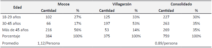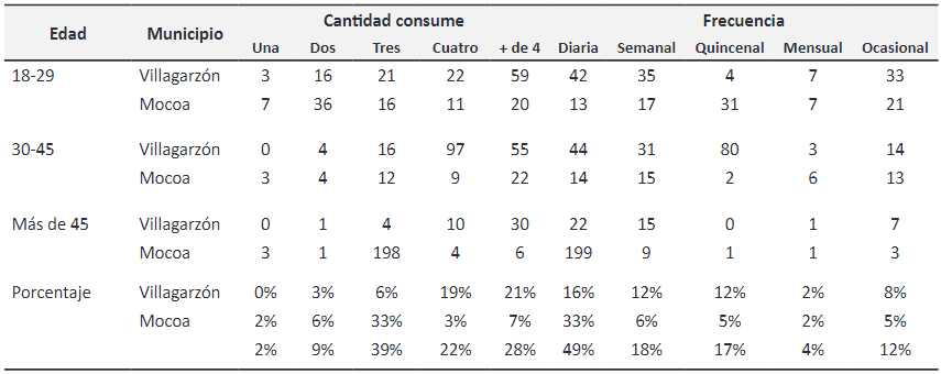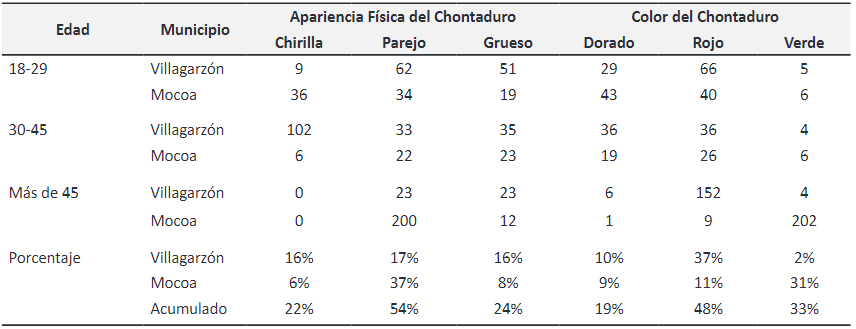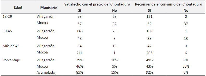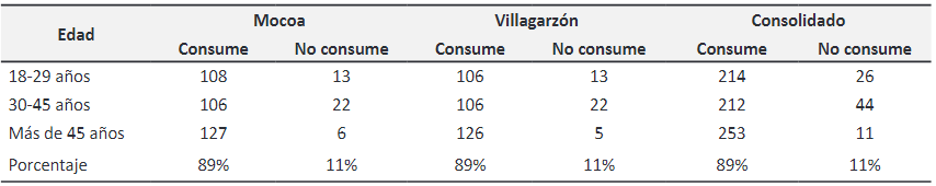 De acuerdo a la Tabla 2 en total el 89% de total de la población en los municipios de Mocoa y Villagarzón consumen el producto del chontaduro. Y el consumo tiene una tendencia positiva desde los 18 años hasta más de 45 años