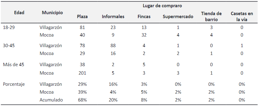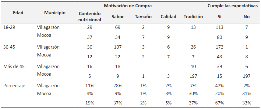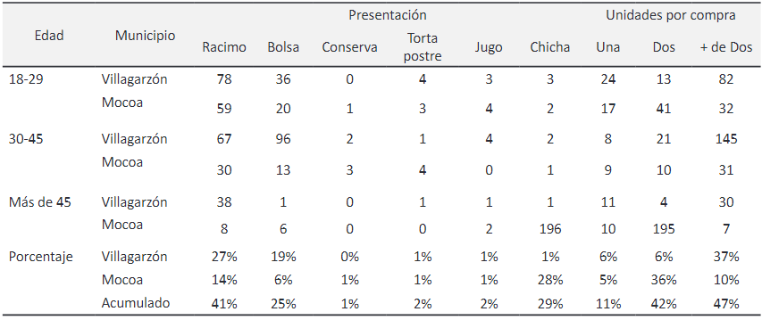 La unidad de consumo es cuando cualquier institución (privada o estatal), grupo o persona que adquiere una cantidad determinada de producto o servicio en el mercado para satisfacer sus necesidades (Alpízar y Hernández, 2015). Entonces, la unidad de consumo chontaduro por persona permite apreciar el consumo tanto en Mocoa y Villagarzón, teniendo En la Tabla 3, el consumo por unidades de chontaduro se aprecia que el producto tiene un consumo promedio 1,12/ persona en Mocoa y en Villagarzón es de 0.89/ persona. Además, se visualiza en el municipio de Mocoa hay un menor consumo entre las personas entre 30 a 45 años, pero en cambio los de mayor de 45 años tiene un porcentaje alto, es decir que es necesario identificar (Kotler, 2012) otros factores asociados a la edad como la etapa del ciclo de vida familiar, la ocupación, las circunstancias económicas, el estilo de vida, la personalidad y otras características personales del comprador que influyen en sus decisiones de consumo del chontaduro. En resumen, el consumo en promedio 1 chontaduro por persona diario.