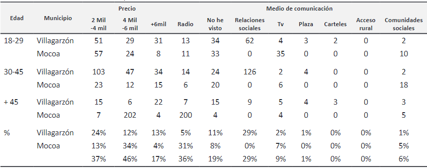 En la Tabla 9 se identifica que el mercadeo y la forma de llegar al cliente se realizan identificando sus necesidades y la forma de satisfacerlas (Philip Kotler citado por Ciribeli y Miquelito, 2015), permite conocer al cliente, el producto y su costo (Pávlov citado por Núñez y otros, 2015) llevando a conocer el mercado, esta es una de la razones por la cual el 49 % de los encuestados menciona que pagan de 4 mil a 6 mil por el producto ya para consumo y su medio más informativo es la radio con el 36 % y las relaciones con el 29%.