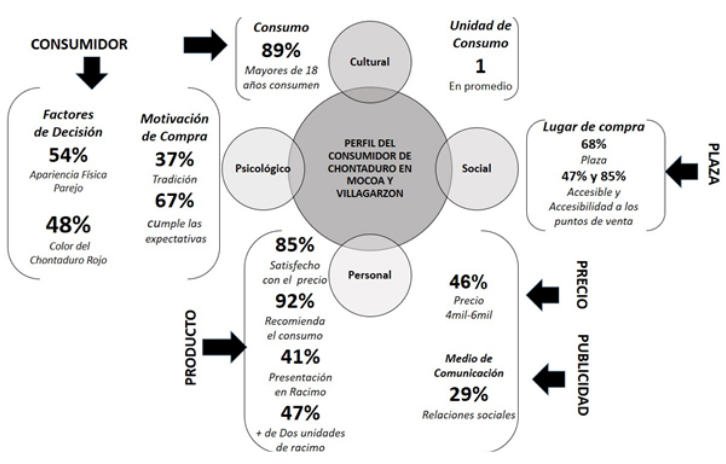 De acuerdo al perfil del consumidor de chontaduro de Mocoa y Villagarzón, en el departamento del Putumayo (Colombia) como lo denominan es un cliente de plaza de mercado (Prieto y Chinchilla, 2019), porque en ciudades tan pequeñas las plazas de mercado son uno de los sectores más beneficiosos para los municipios de Mocoa y Villagarzón, dado que satisface una necesidad de primera categoría y aporta a la economía del departamento del Putumayo, considerado como un sitio accesible para la compra del chontaduro y este análisis se hace importante para dicho sector, donde existe un comercio bastante notorio en cuanto a los productos que se producen en la región y suministran alimentos a los diferentes poblaciones tanto urbanas y rurales. Por lo anterior, el perfil de consumidor de chontaduro de Mocoa y Villagarzón, son una parte fundamental de las plazas de mercado, dado que son ellos quienes realmente mueven su economía. En el mercado abundan diferentes opciones para cubrir una misma necesidad, así el consumidor se encuentra ante una variedad de chontaduro y de vendedores que lo pueden proveer, sin embargo, comprender el procedimiento mediante el cual los consumidores toman sus decisiones, eligen sus productos, en el sitio de compra, precio a pagar, cantidad a llevar, presentación en racimos, origen y satisfacer sus necesidades, no es sencillo (Bacca, 2008 citado por Prieto y Chinchilla, 2019). Un vendedor por lo general es el quien cultiva el chontaduro y recurre a un conjunto de tácticas para persuadir a un consumidor, y este probablemente comprará por dos razones, encuentra lógico los argumentos de venta. En esta estrategia de venta del chontaduro en el mercado se contempla el Cliente, Precio, Producto, Publicidad y la Plaza de una manera empírica. Por lo tanto, no hay demeritar este tipo de cliente porque según Marshall y Philip Kotler cumple con las características de un consumidor que permitieron obtener el perfil.