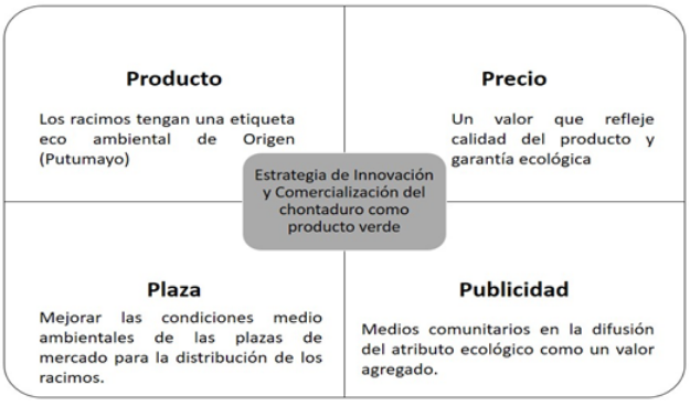 Estrategia de innovación y comercialización basadas en la mezcla de mercadeo (Coddington, 1993 citado por Prieto y Urdaneta, 2015), que permite posicionar el chontaduro como un producto verde, es necesario tomar en cuenta factores tales como: Las características del usuario; Los canales de distribución que han de establecerse; Los beneficios ecológicos del chontaduro; El etiquetado de origen del chontaduro, y tener en cuenta la política medioambiental en la plaza de mercado; y el precio del chontaduro por racimo.