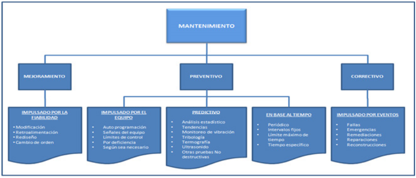 Del mismo modo, Stephens (2010) señala que el mantenimiento puede ser dividido en tres complejos grupos o categorías, delimitadas de acuerdo al modo de planificación y ejecución de las mismas, divididas en: el mantenimiento correctivo o reactivo, el mantenimiento preventivo y el mantenimiento predictivo. Para González (2005), citando algunas normas europeas (EN- 13306 / AFNOR NFX 60-010); detalla que dichas normas engloban tres tipos de mantenimientos: El correctivo, el preventivo y el predictivo, y en algunos casos, este último inmerso como parte del mantenimiento preventivo.