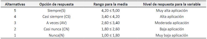 La técnica aplicada para la recolección de datos fue la encuesta, utilizando para ello como instrumento un cuestionario con 7 ítems. Se utilizó la escala de frecuencia considerando las opciones: siempre, casi siempre, a veces, casi nunca y nunca. El mismo respondió a una confiabilidad de 0,84 bajo el coeficiente Alfa de Cronbach, considerado de muy alta confiablidad, previa validación por expertos. Para interpretar los resultados de la media aritmética se construyó un baremo, el cual se muestra en la Tabla 1